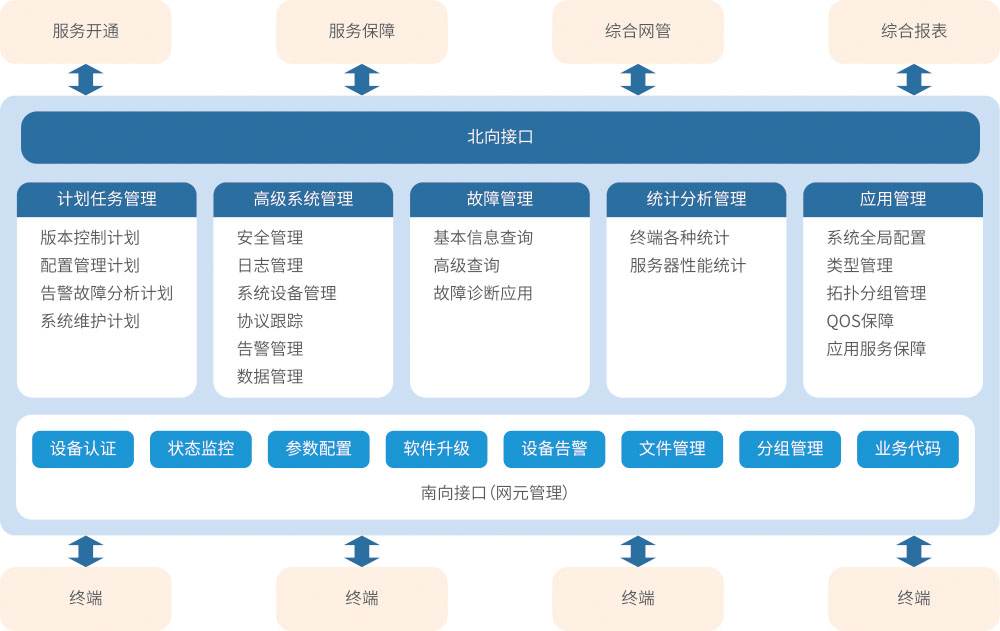 提供豐富的系統(tǒng)接口,支持北向與BOSS系統(tǒng)集成,南向與網(wǎng)關(guān)集成,為系統(tǒng)的運行和維護提供全面支持。