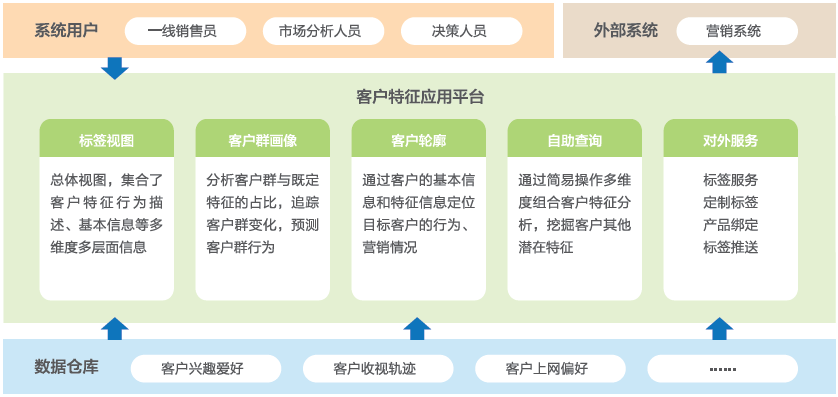 客戶全景洞察平臺(tái)基于不同角色的應(yīng)用目的,以技術(shù)驅(qū)動(dòng)和數(shù)據(jù)算法為核心,全方位洞察客戶需求,預(yù)測(cè)客戶群行為,洞悉市場(chǎng)發(fā)展,讓企業(yè)對(duì)市場(chǎng)有完整且真實(shí)的認(rèn)知。該平臺(tái)具有標(biāo)簽視圖、客戶群畫像、客戶輪廓、自助查詢和定制服務(wù)五大功能模塊,深度挖掘商機(jī),為企業(yè)決策層、業(yè)務(wù)人員、市場(chǎng)分析人員和一線營(yíng)銷人員提供基于運(yùn)營(yíng)商大數(shù)據(jù)的營(yíng)銷決策支持服務(wù)。