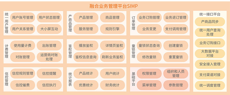 統(tǒng)一業(yè)務(wù)管控:靈活的產(chǎn)商品模型,豐富的營(yíng)銷方案,精準(zhǔn)的計(jì)費(fèi)策略,實(shí)現(xiàn)視頻業(yè)務(wù)、游戲、購(gòu)物等多種業(yè)務(wù)的融合銷售,營(yíng)銷更靈活。