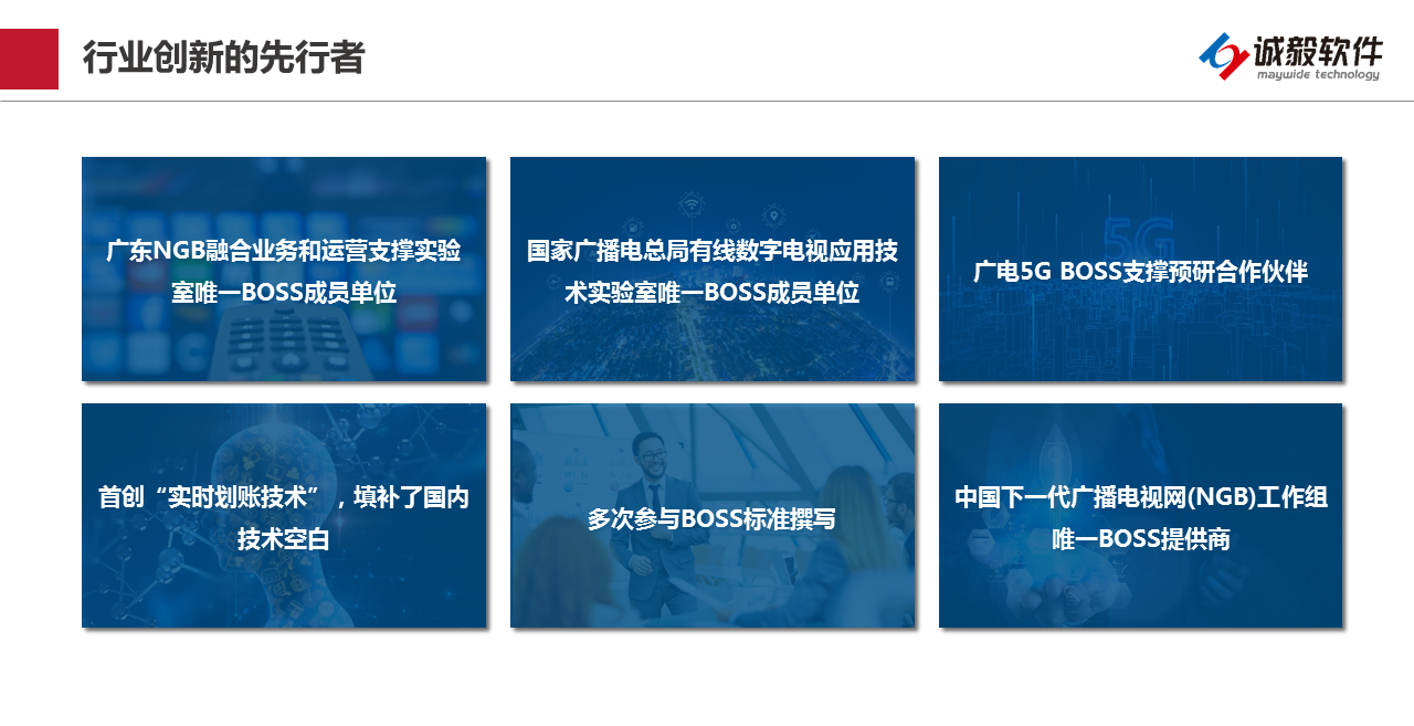 誠(chéng)毅軟件的領(lǐng)先技術(shù)、過(guò)硬品質(zhì)和卓越服務(wù)能力,得到了行業(yè)權(quán)威機(jī)構(gòu)的認(rèn)可與肯定。我們多次參與廣電BOSS標(biāo)準(zhǔn)撰寫、主筆廣電行業(yè)大數(shù)據(jù)標(biāo)準(zhǔn)規(guī)范,是國(guó)家廣播電總局有線數(shù)字電視應(yīng)用技術(shù)實(shí)驗(yàn)室唯一BOSS成員單位、中國(guó)下一代廣播電視網(wǎng)(NGB)工作組唯一BOSS提供商、廣東NGB融合業(yè)務(wù)和運(yùn)營(yíng)支撐實(shí)驗(yàn)室唯一BOSS成員單位,是廣電5G BOSS支撐預(yù)研合作伙伴。我們參與、引領(lǐng)并見(jiàn)證了廣電運(yùn)營(yíng)支撐領(lǐng)域從無(wú)到有的全過(guò)程,積極促進(jìn)行業(yè)標(biāo)準(zhǔn)的建立與完善,有力支撐了通信、廣電等行業(yè)跨越式發(fā)展。