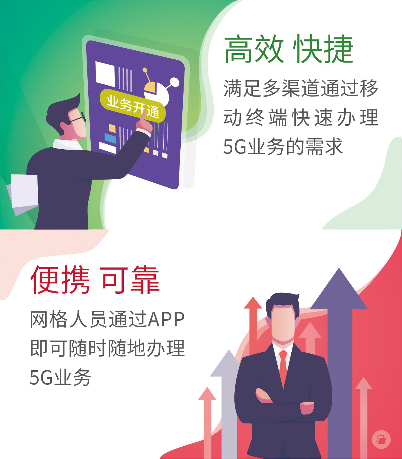 為實(shí)現(xiàn)貴廣網(wǎng)絡(luò)5G業(yè)務(wù)快速推廣,我們?cè)?G云化BOSS基礎(chǔ)上,研發(fā)了移動(dòng)化的5G業(yè)務(wù)便攜辦理系統(tǒng)——掌上BOSS,可對(duì)接讀卡器設(shè)備和無(wú)紙化協(xié)議簽寫(xiě),支持人臉識(shí)別和無(wú)紙化受理等業(yè)務(wù)場(chǎng)景。網(wǎng)格營(yíng)銷(xiāo)人員只需隨身攜帶手機(jī)/Pad等移動(dòng)終端和藍(lán)牙讀卡器,即可按照約定的時(shí)間和地點(diǎn)為用戶辦理5G業(yè)務(wù),整個(gè)開(kāi)戶流程簡(jiǎn)單便捷,最快5分鐘完成選號(hào)開(kāi)卡。