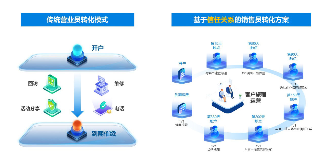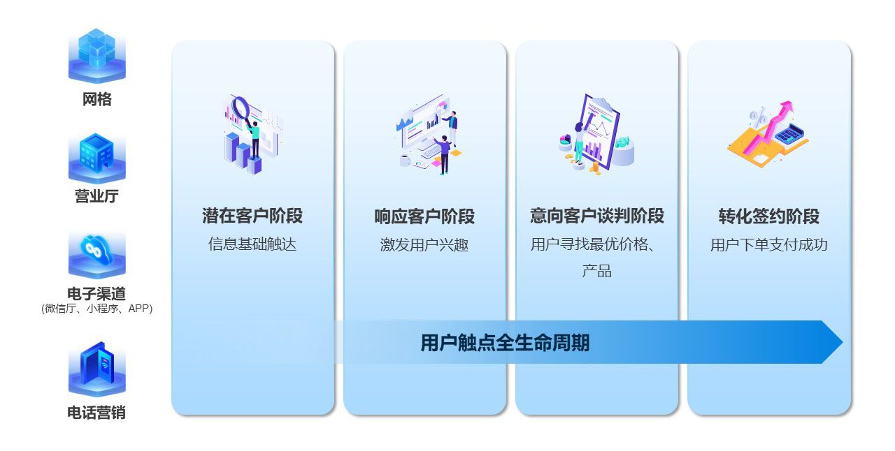 圍繞客戶需求,覆蓋從潛在客戶觸達、新客戶轉化、老客戶維護到流失客戶召回的全過程,實現個性化服務,提升滿意度。